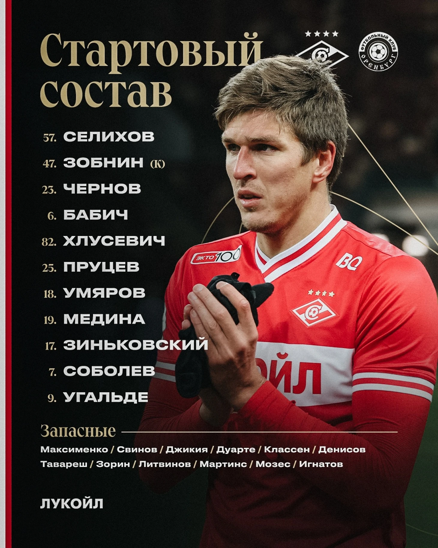 «Спартак»: Селихов, Зобнин (к), Чернов, Бабич, Хлусевич, Пруцев, Умяров (Литвинов, 66), Медина (Мозес, 46, Мартинс, 74), Угальде (Игнатов, 86), Соболев, Зиньковский.