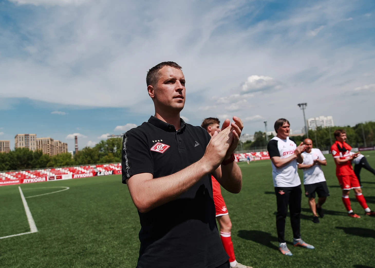 Перед матчем. Лето в Москве началось с 30-градусной жары. Как и положено, в середе каждого из таймов арбитр давал паузу на водопой.