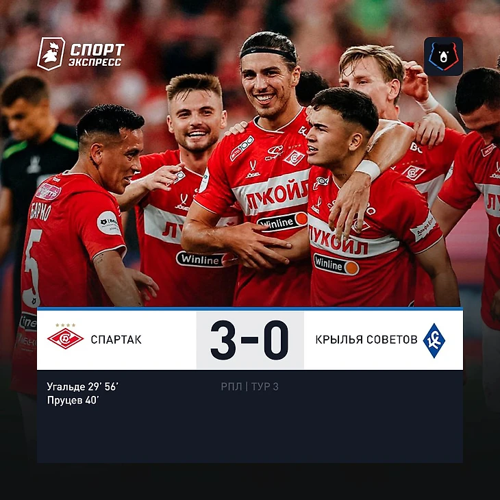 «Спартак» с разгромным счетом обыграл «Крылья Советов» в домашнем матче 3-го тура чемпионата России — 3:0.