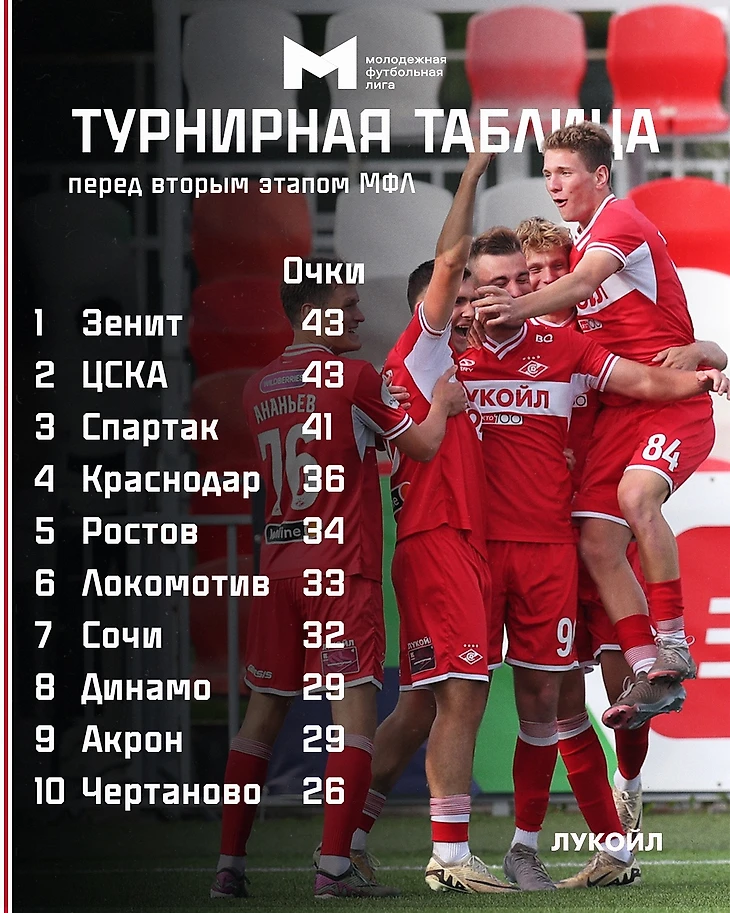 Следующий матч. Календарь второго этапа, который стартует 23 августа, будет опубликован в начале следующей недели. «Спартаку» предстоит провести по два матча с ЦСКА, «Зенитом», «Ростовом», «Динамо» и «Чертановом».