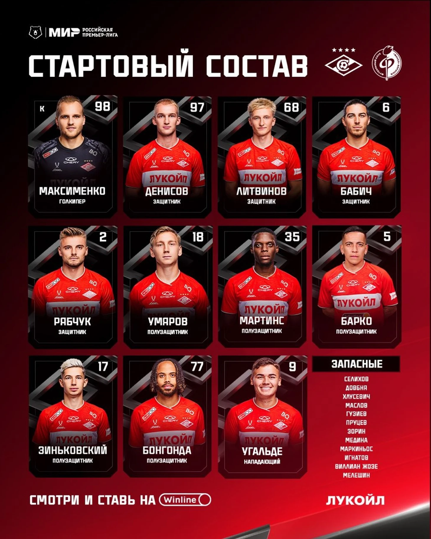 «Спартак»: Максименко (к), Денисов, Рябчук, Литвинов, Бабич, Умяров (Зорин, 80), Мартинс (Пруцев, 65), Барко, Бонгонда (Медина, 65), Зиньковский (Маркиньос, 65), Угальде (Виллиан Жозе, 80).