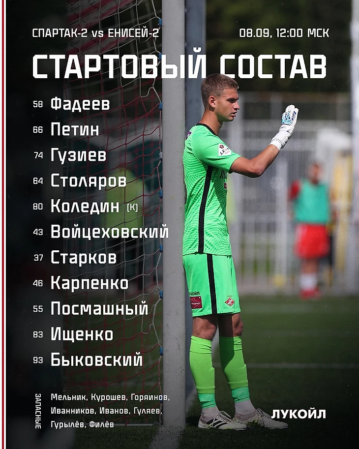«Спартак-2»: Фадеев, Петин, Гузиев, Столяров, Коледин (к) (Иванников, 83), Войцеховский, Старков (Иванов, 68), Карпенко, Посмашный (Гуляев, 68), Ищенко (Гурылёв, 83), Быковский (Филёв, 60).