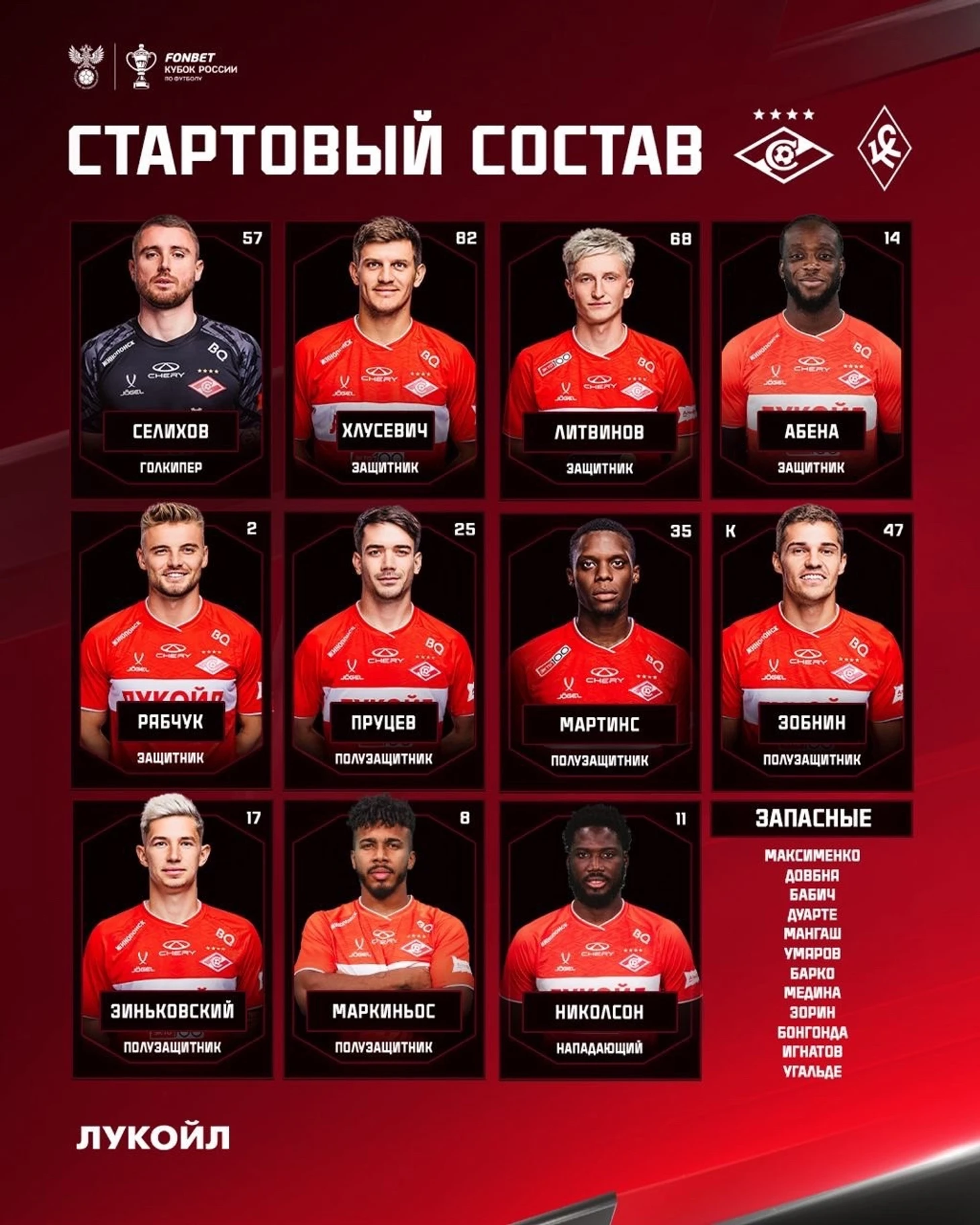 «Спартак»: Селихов, Рябчук, Литвинов, Абена, Хлусевич, Пруцев, Мартинс, Зобнин (к), Маркиньос, Зиньковский, Николсон.