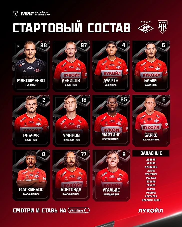 «Спартак»: Максименко (к), Денисов, Дуарте, Бабич (Чернов, 88), Рябчук (Мангаш, 83), Умяров, Мартинс, Барко, Маркиньос, Бонгонда, Угальде.