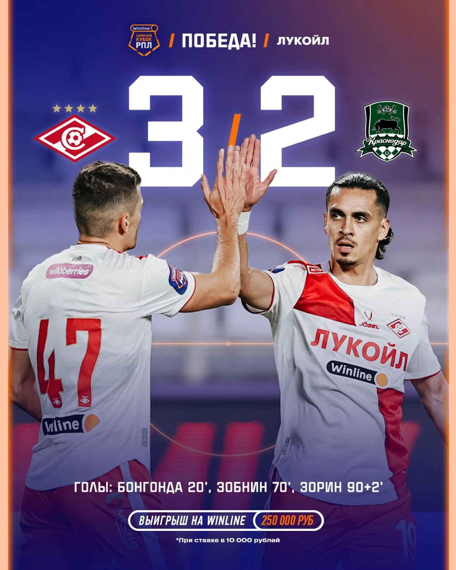 Сегодня, 30 января, в ОАЭ состоялся матч Winline зимнего кубка РПЛ, в котором «Спартак» победил «Краснодар» со счетом 3:2.