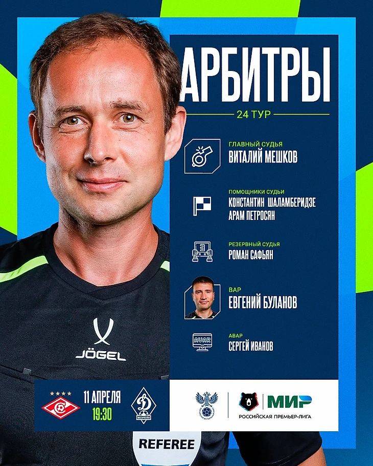 Назначена судейская бригада на матч 24-го тура РПЛ «Спартак» — «Динамо» Махачкала, который состоится 11 апреля.