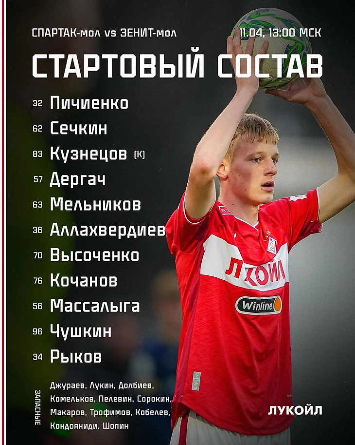 «Спартак»: Пичиенко, Сечкин, Кузнецов (к), Дергач, Мельников, Аллахвердиев (Пелевин, 66), Высоченко, Кочанов, Массалыга, Чушкин (Сорокин, 76), Рыков.