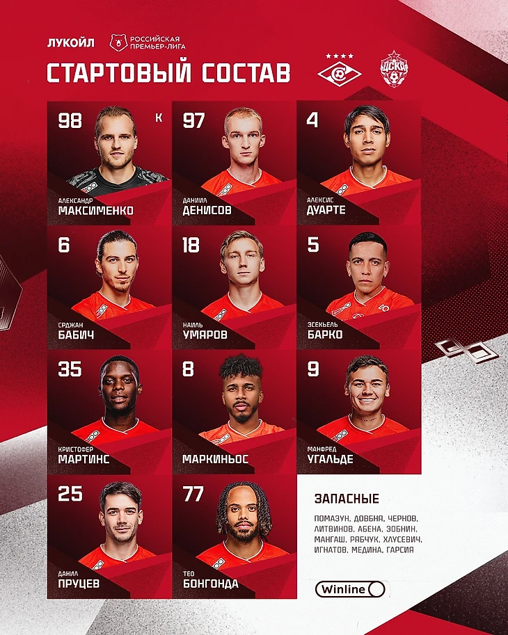 «Спартак»: Максименко (к), Денисов, Дуарте, Бабич, Умяров, Барко, Мартинс, Маркиньос, Угальде, Пруцев, Бонгонда.