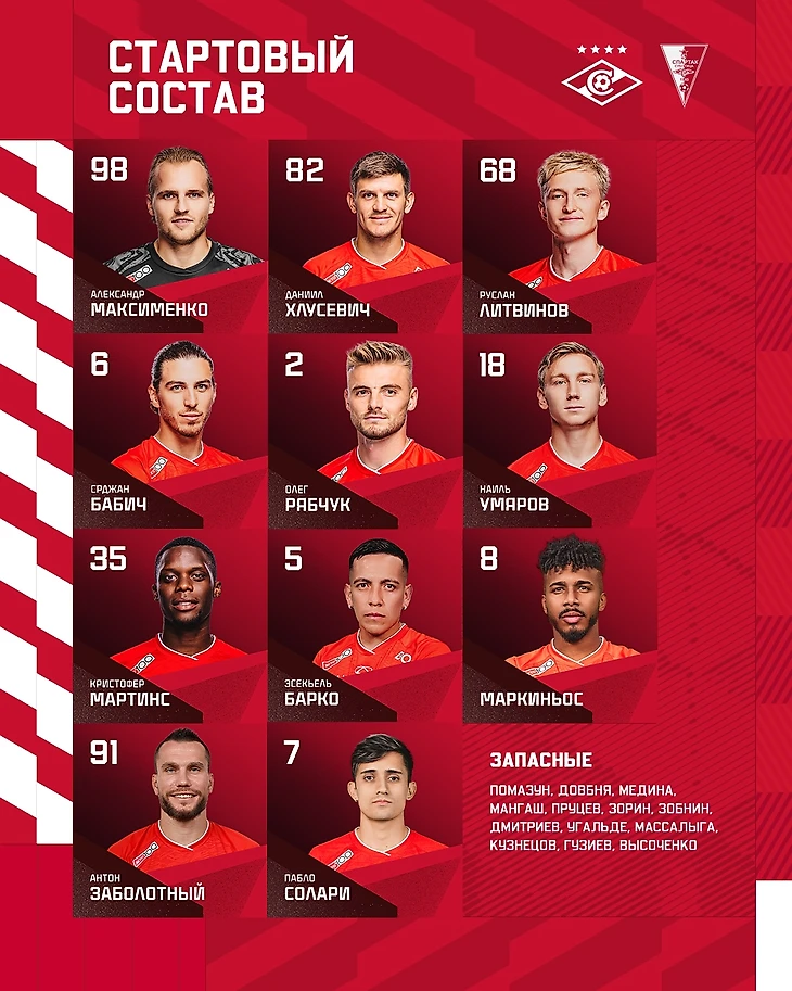 «Спартак»: Максименко (к), Бабич, Рябчук, Умяров, Барко, Мартинс, Литвинов, Заболотный, Маркиньос, Хлусевич, Солари.