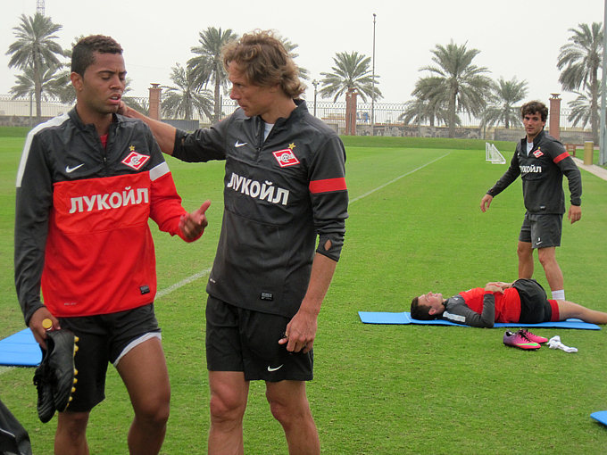 Карпин, в общем-то, хотел ровно того же. Когда я поздравил его и поинтересовался, какого презента ждёт от футболистов, услышал: "Да пусть выиграют послезавтра". В этот день "Спартак" проведёт свой второй матч в Эмиратах – против местного клуба "Аль-Дафра". Скромны, однако, запросы у Валерия Георгиевича… Карпин всем своим видом показывал, что день рождения не имеет к тренировке ровным счётом никакого отношения. Например, сам тут же пошёл расставлять по полю фишки. А когда находящийся далеко не в лучшем состоянии Динияр Билялетдинов (на сбор он, говорят, приехал с тремя кило лишнего веса, хотя сейчас больше половины "груза" вроде как уже скинул) напортачил в упражнении, на несколько секунд остановил тренировку: "Билл, два касания в той зоне, ты слушаешь или нет?!"