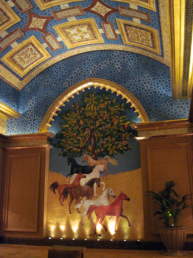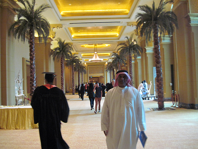 Спокойно по гостинице, не будучи её постояльцем, кстати, не погуляешь. На каждом шагу тебя встречает идеально вежливый, вышколенный арабский охранник (тут вообще всё – с широченной улыбочкой, по-английски, сладким голосом: если захочешь, не придерёшься!) и спрашивает: "Вы живёте в этом отеле?" Ответ "да" чаще всего удовлетворяет, но самым любопытным приходится демонстрировать ключ. Режимная территория по-эмиратски!