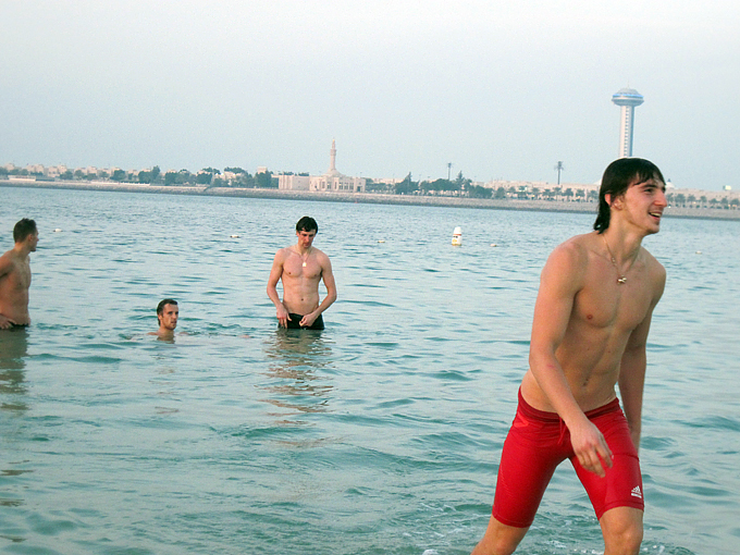 Протяжённость пляжной линии, принадлежащей только Emirates Palace, составляет 1 300 метров. Но после инцидента в первый вечер с морским ежом, бесчеловечно поступившим с Кириллом Комбаровым, вот такие картинки со счастливым Павлом Яковлевым и Ко, сделанные в тот же вечер, более неактуальны: