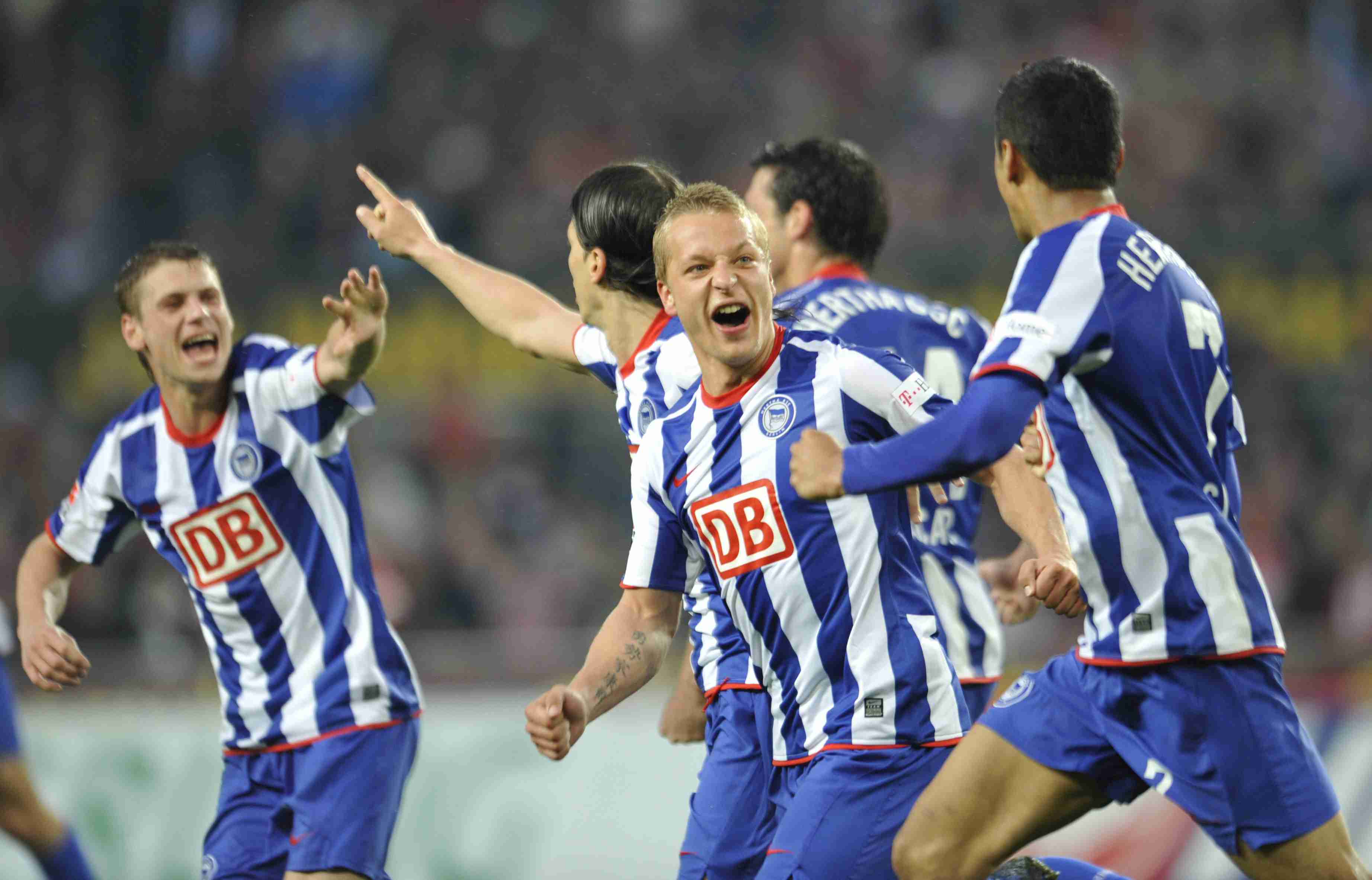 Полузащитник "Герты" Патрик ЭБЕРТ празднует с партнерами по команде забитый гол. Фото REUTERS