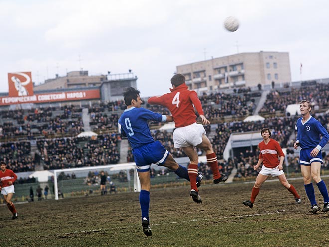 11.10.1970. «Динамо» — «Спартак» — 0:0. Слева направо: Юрий Авруцкий (№9), Евгений Ловчев (№4), Виктор Папаев («Спартак») и Евгений Жуков («Динамо»)