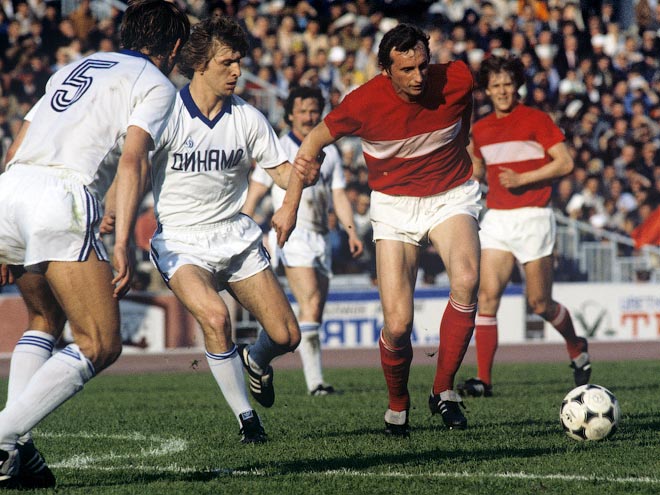 19.06.1985. «Спартак» — «Динамо» — 5:1. Слева направо: Александр Головня (№5), Борис Поздняков, Юрий Пудышев, Юрий Гаврилов и Евгений Кузнецов