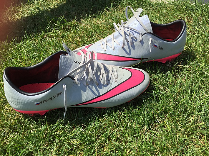 Пока футболисты занимались, было время рассмотреть внимательнее их спортивный инвентарь. Кто-то нашивает на бутсы собственную фамилию и номер, а кто-то – имена самых близких людей. Как, к примеру, Роман Широков.