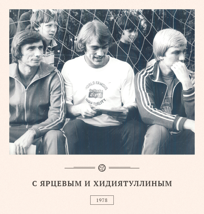 Тарасовка. Перед тренировкой. На фото трио спартаковцев – Ярцев, Хидиятуллин и я. При одном взгляде на этот снимок сразу вспоминается история о том, как Ярцев стал частью «народной команды». В 1977 году перед началом сезона мы проводили товарищеский матч со «Спартаком» из Костромы, за который на тот момент выступал Георгий.