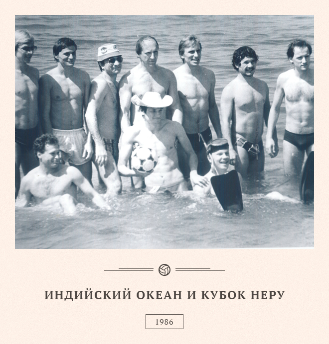 Кубок Джавахарлала Неру. Отдых сборной СССР. Фото национальной команды в Индийском океане. На этом снимке, например, можно увидеть знаменитого врача сборных СССР и России Зураба Орджоникидзе и обладателя «Золотого мяча» 1986 года Игоря Беланова (крайний справа). Я – крайний слева. Мы стали победителями того турнира, обыграв в финальном матче сборную Китая со счётом 1:0.