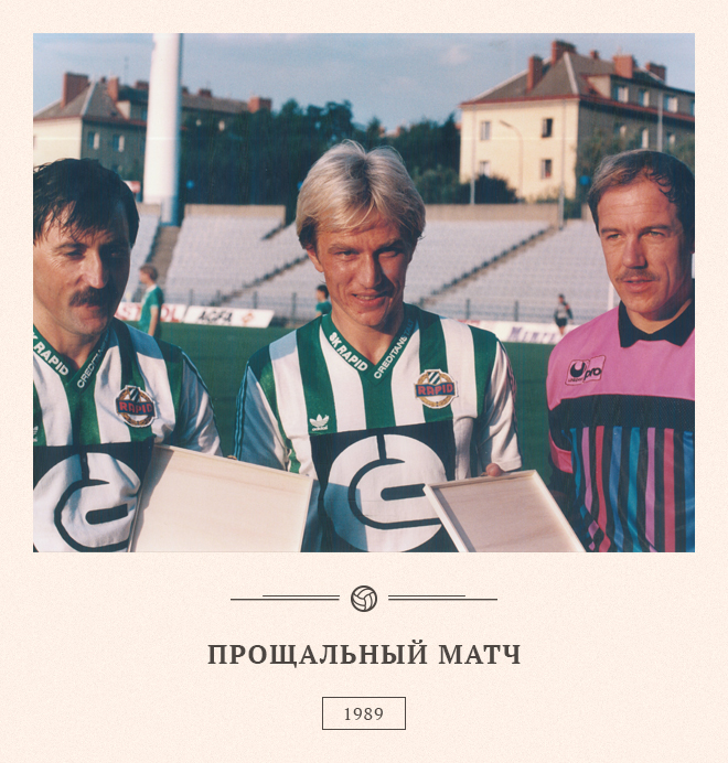 Стадион «Рапида». Прощальный матч для трёх бывших футболистов «Рапида». Игра с бременским «Вердером». На фото слева-направо – Антонин Паненка, я и Хедад Фойрер. После игры нам подарили по специальной красивой тарелке в благодарность за годы проведённые в клубе.