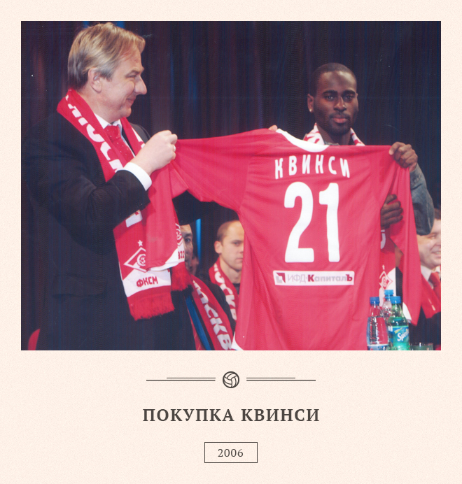 Презентация голландского и ганского футболиста Квинси в качестве полузащитника «Спартака». Он был талантливым футболистом, но разгильдяем. Изначально мы на него возлагали большие надежды, ведь не каждый раз возникает возможность приобрести футболиста лондонского «Арсенала».