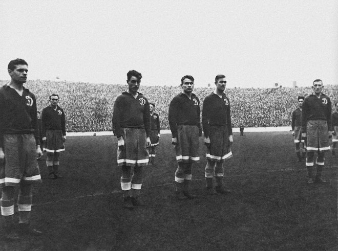 Футболисты московского «Динамо» (слева направо) Василий Карцев, Всеволод Блинков, Константин Бесков, Всеволод Бобров и Михаил Семичастный
