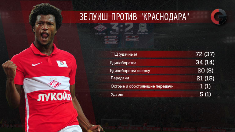 Зе Луиш стал лучшим на поле по количеству единоборств, причем с очень солидным показателем – 34 дуэли. Пусть выиграл он менее половины, – лишь 14, однако сам факт заряженности и самоотдачи заслуживает внимания. Чаще всех африканский футболист боролся и вверху – 20 единоборств на "втором этаже", восемь победных. Нередко он опускался в глубину, на позицию "опорного нападающего", и там помогал команде зацепиться за мяч и развить атаку.