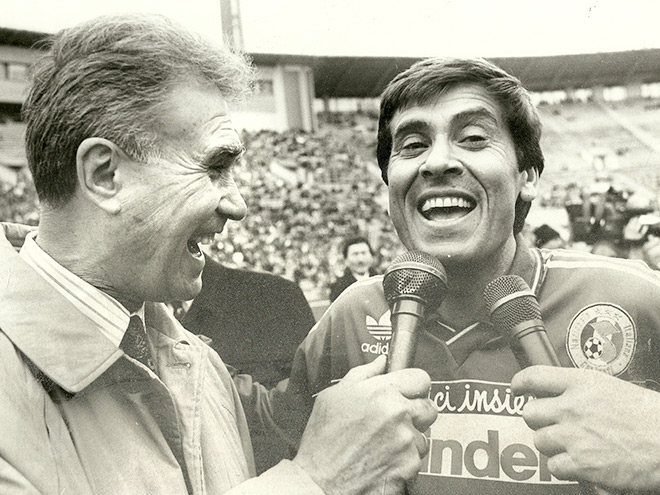 Маслаченко берёт интервью у человека в майке сборной Италии. Может показаться, что справа на фотографии футболист, но это не так. Это итальянский певец Джанни Моранди, который приезжал в СССР с гастролями.