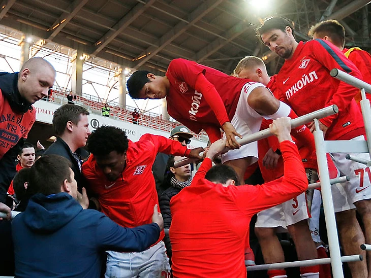 Другие болельщики – с фанатского сектора – выражали недоверие по-другому. Сначала они устроили игрокам «Спартака» 90 минут экзекуции. Потом захотели общения с ними по-мужски. Несколько спартаковцев – например Промес и Зуев – подошли к болельщикам и подарили им футболки. Чьи-то кинули на землю.