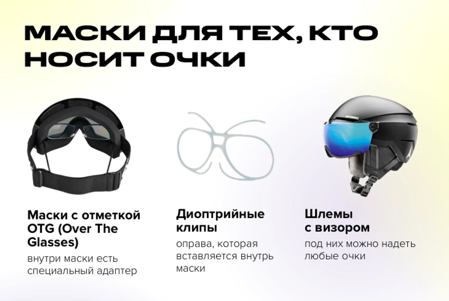 Идеальный вариант – надевать контактные линзы на время катания. Но есть и те, кто по медицинским показаниям или принципам комфорта предпочитает надевать привычные очки. На этот случай есть несколько альтернатив: