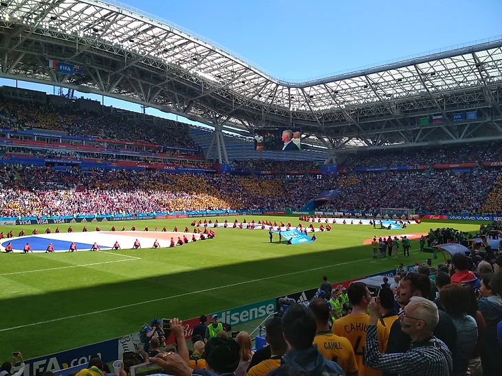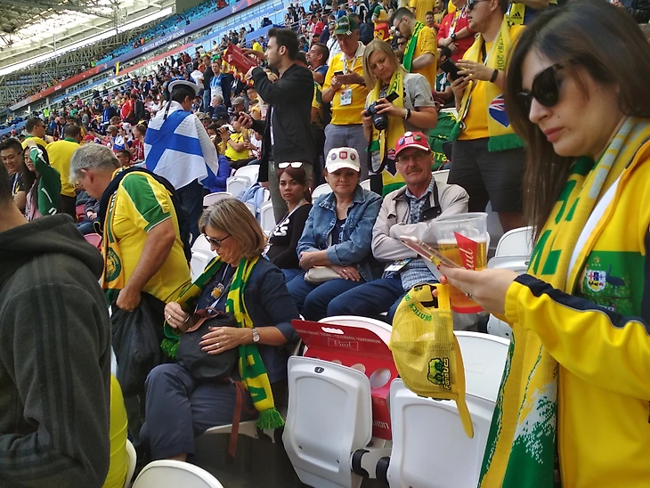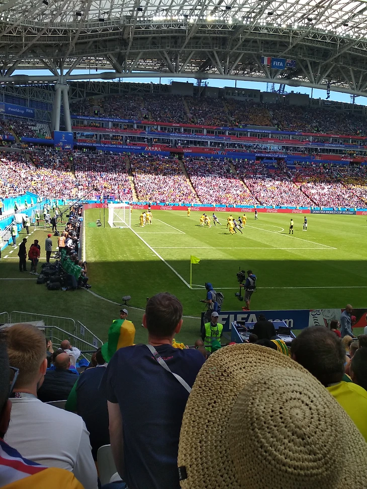 На игру я поехал с братом и родителями. Мы были уверены, что бОльшую часть болельщиков составят французы, но каково же было наше удивление, увидев огромное количество людей в жëлтой одежде. Австралийцы были повсюду - гуляли на улице, заполняли городской транспорт, толпились в магазинах. Редко среди всего этого ярко-жëлтого нашествия встречались люди в синих футболках. Мы прошли на территорию стадиона. Здесь тоже преобладали жëлтые цвета.