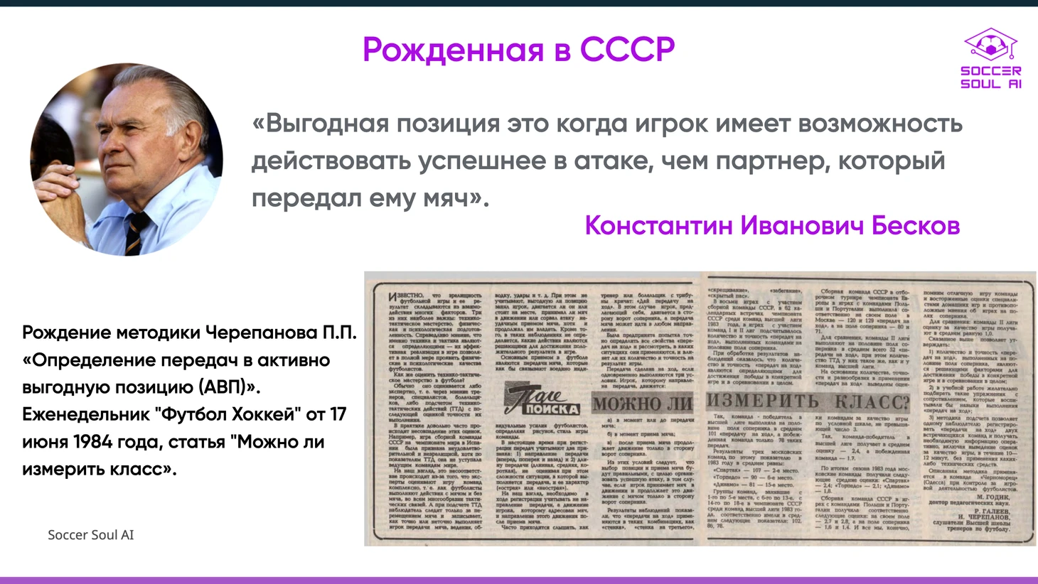 Методика у истоков которой еще в 50-е годы стоял Константин Иванович Бесков, адаптирована под современные реалии футбола, командой лаборатории футбольной аналитики - Soccer Soul _AI при участии Черепанова П.П.(автора методики определения передач в АВП) и группы российских тренеров. С использованием методологии, на базе 350+ матчей, сформирован набор показателей, по которым нейросеть выявляет игровые преимущества и недостатки.