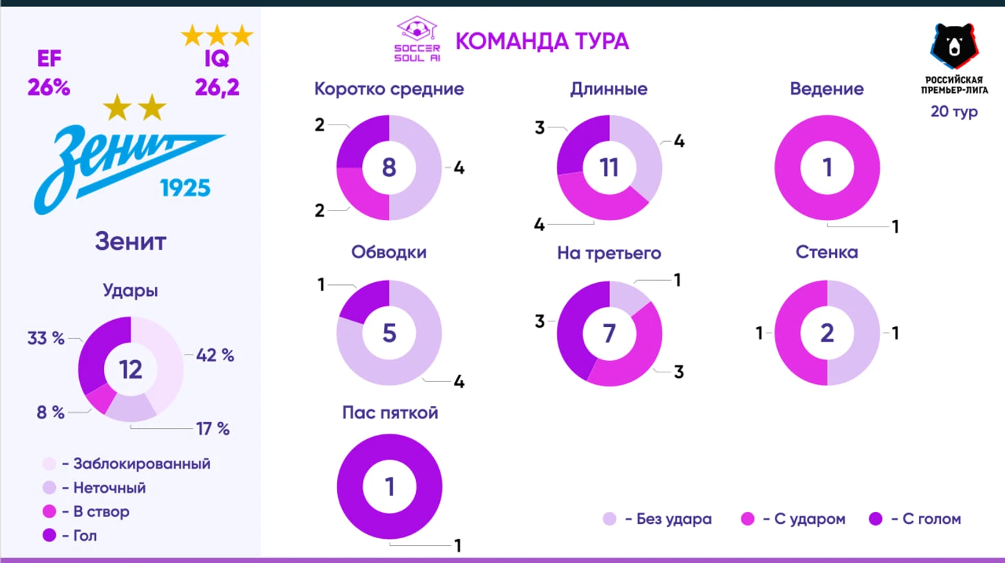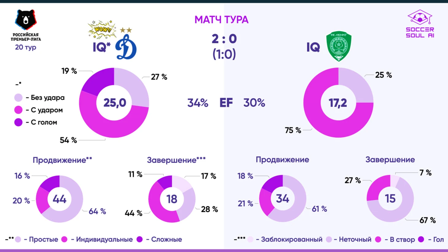 90% IQ – в ударных и голевых атаках. 7 успешных игровых элементов фазы продвижения, два удара по воротам с точностью 50%.
