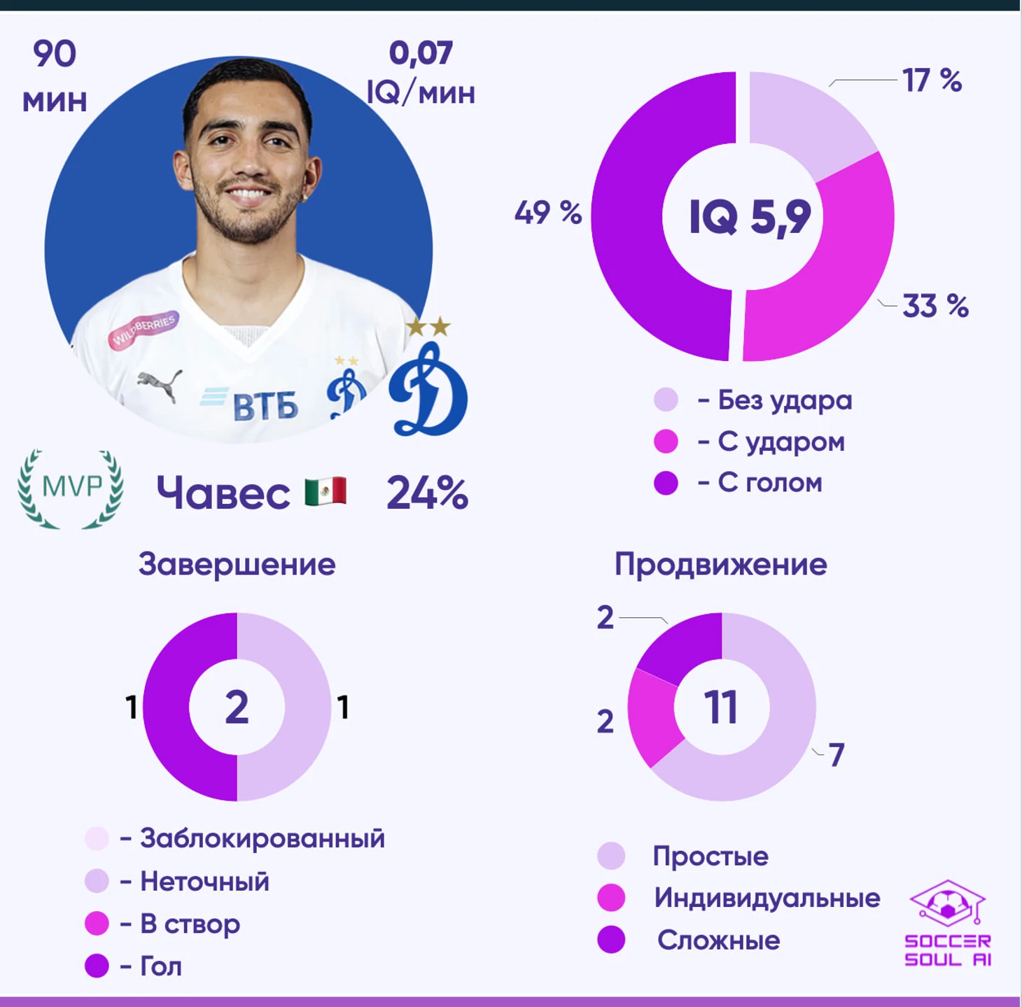 Пара центральных полузащитников: Чавес🇲🇽 (Динамо) – IQ 5,9 (219%). MVP тура 🏆