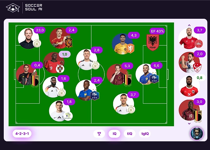 Запас: Чалханоглу (Турция) – 2,0 IQ; Модрич (Хорватия) – 1,9 IQ; Тилеманс (Бельгия) – 1,7 IQ; Витинья (Португалия) – 1,7 IQ.