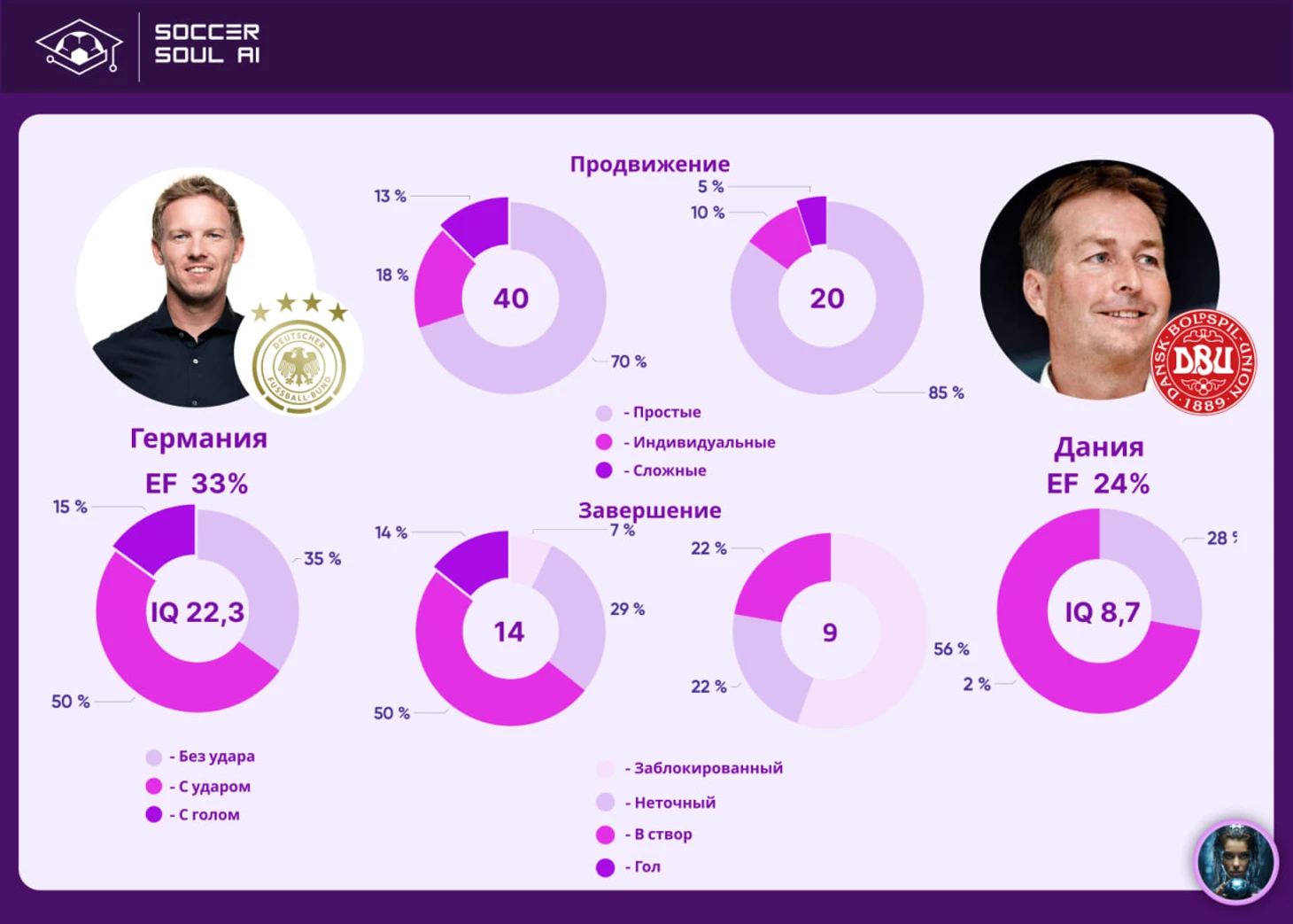И эффективность (33% vs 24%), и точность ударов (64% vs 22%), количество самих ударов (14 vs 9) и количество успешных действий через АВП в фазе продвижения (40 vs 20) – во всём немцы ожидаемо были лучше.