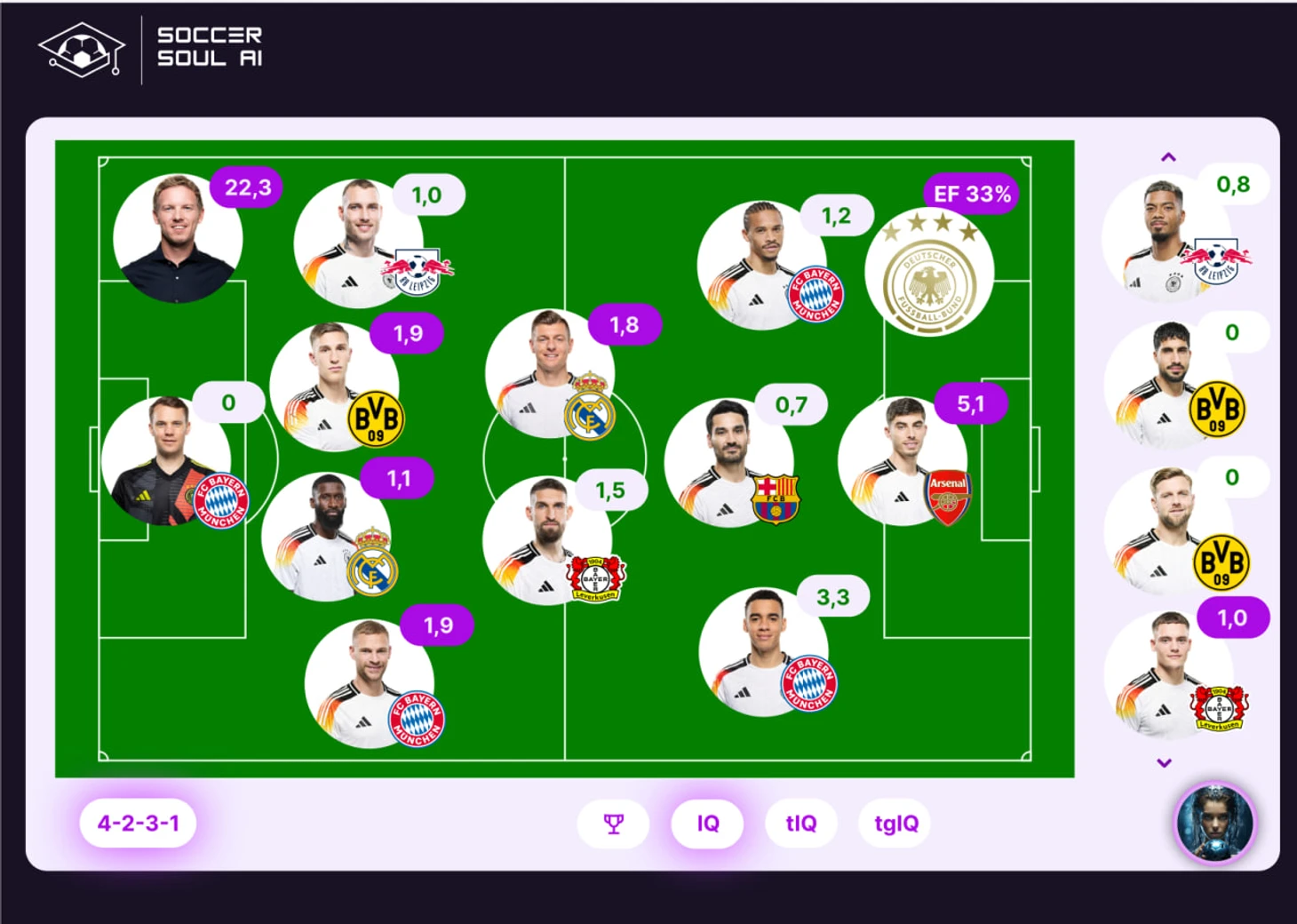 MVP матча: Хавертц – 5,1 IQ и это его лучшая на данный момент игра на турнире. Стоит выделить и Мусиалу (3,3 IQ), показывающего стабильно качественный футбол – игрок не опускается ни в одной из игр ниже уровня 3,2 балла.