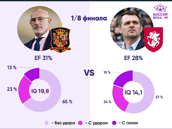 Грузины по-своему уникальны. С долей простых (56%) и индивидуальных (35%), которые в голевом IQ соотносятся 50% на 50% грузинская команда наиболее результативна среди всех участников 1/8 в применении индивидуальной игры своих лидеров. В этом и надежда на матч с Испанией, и опасность – очевидность угрозы подразумевает наибольшее внимание к игрокам эту угрозу представляющим.