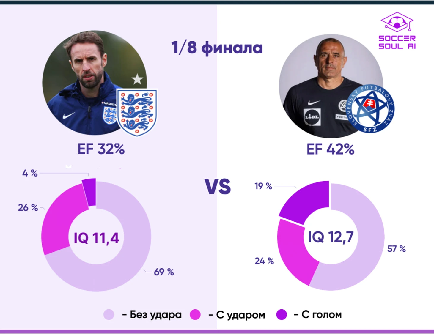 Словаки гораздо более универсальны (57% - 24% - 19%) по типам выполняемых действий, но индивидуальные элементы при этом у них совсем не результативны. Однако они имеют одну из самых высоких долей сложных игровых действий в голевом IQ – 40%! Плюс по точности ударов уступают англичанам не сильно (тут тоже 40%).
