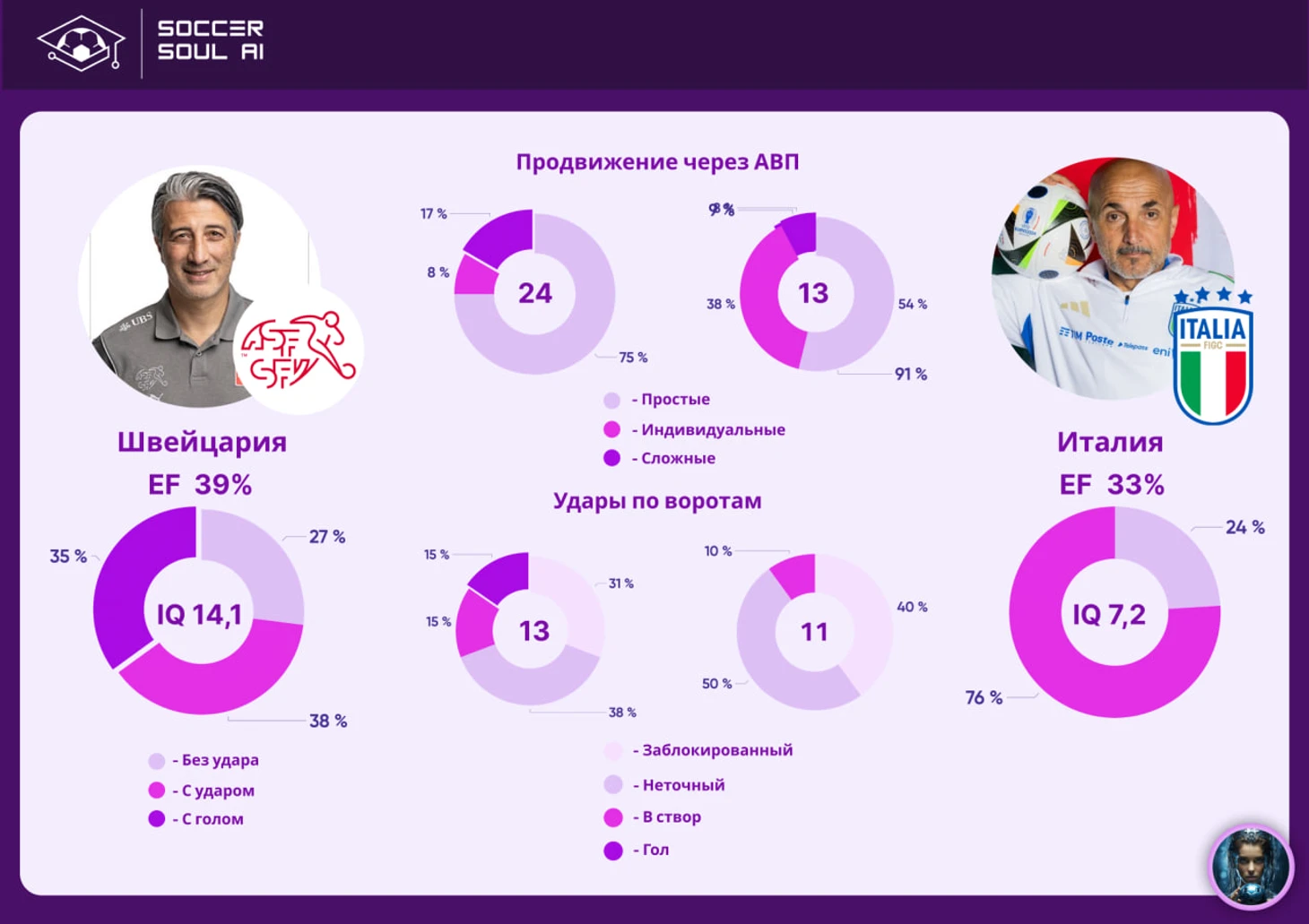 Осталось загадкой во что играли итальянцы, показав совершенно несвойственную им на групповом этапе игру. Перед матчем мы рассуждали на тему, как Италии сделать результативной её сложные командные взаимодействия, а в итоге получили 38% индивидуальных, говорящих о том, что о каком-либо коллективном взаимодействии в этом матче можно забыть. И сложные (8%), и простые (54%) говорят о том, что команда в этом матче перестала делать всё то, что делала в предыдущих играх (да, с разным уровнем успеха, но последовательно) и играла просто так, как умеют игроки.
