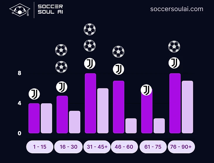 К одним из таких неочевидных явлений можно отнести начало и конец матча в исполнении Юве. Согласно интервальному анализу АВП-действий команды – первая треть первого тайма является наиболее пассивным игровым отрезком, а завершающая треть второго – наиболее активным со стороны соперников. В свете того факта, что команда в чемпионате еще не пропускала, второе наблюдение может показаться статистикой ради статистики, но единственный пропущенный мяч (в дебютной игре Лиги чемпионов) пришёлся как раз на математически опасный для Юве игровой интервал.