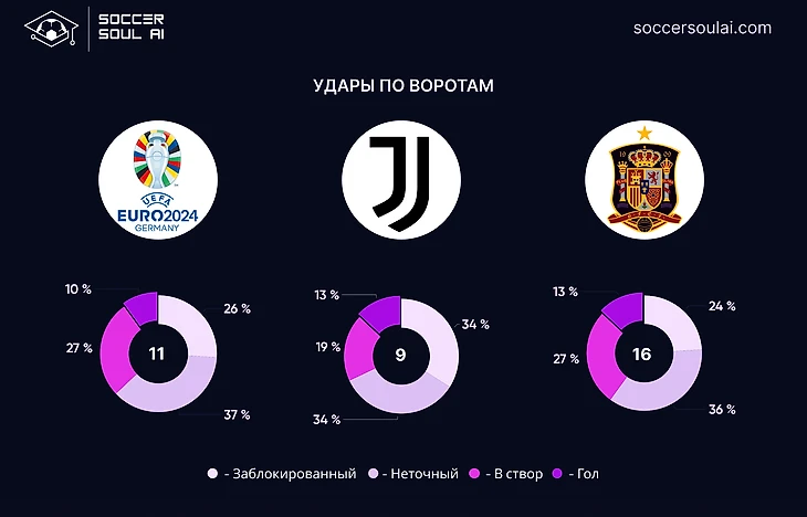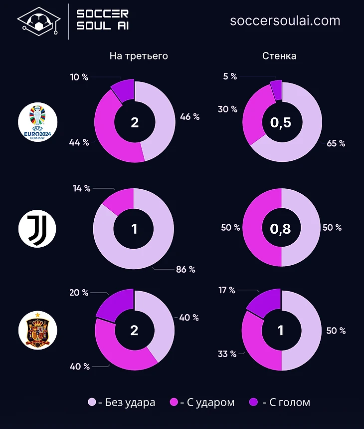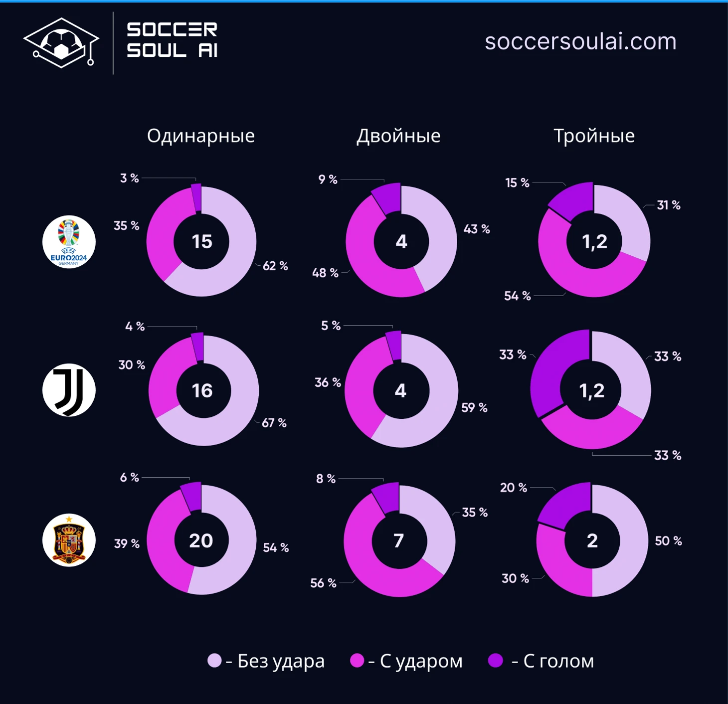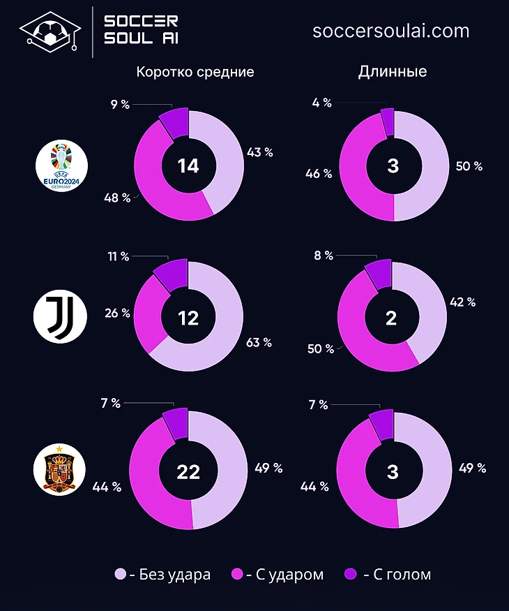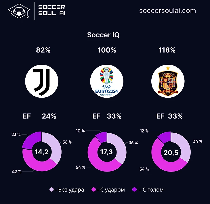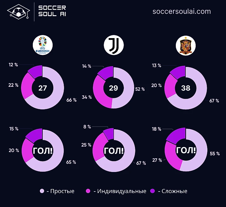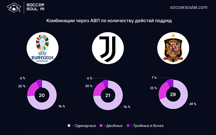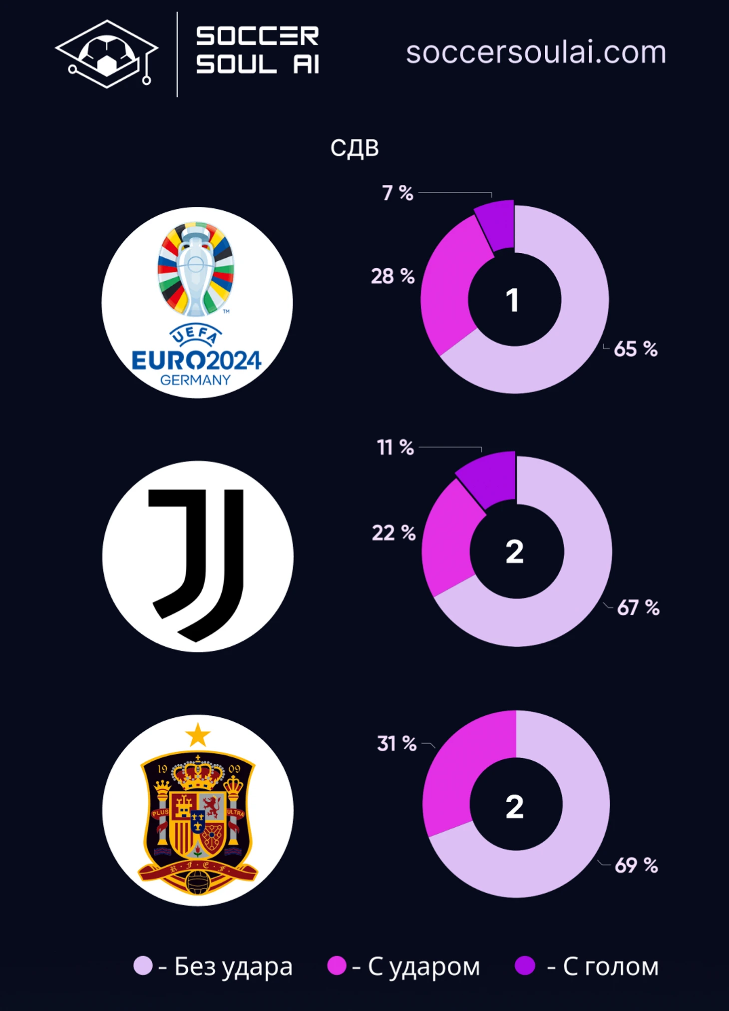 Такими нормативом в АВП-методике выступают – аватар команды уровня чемпионата Европы (рассчитанный на базе показателей всех участников Евро-2024), а эталоном непосредственно чемпионов Европы – сборной Испании.Гол – основа футбольного матча, его цель и кульминация всех игровых действий. 88% голов на Евро-2024 были забиты после действия через АВП, у чемпионов этот показатель составил 100%.