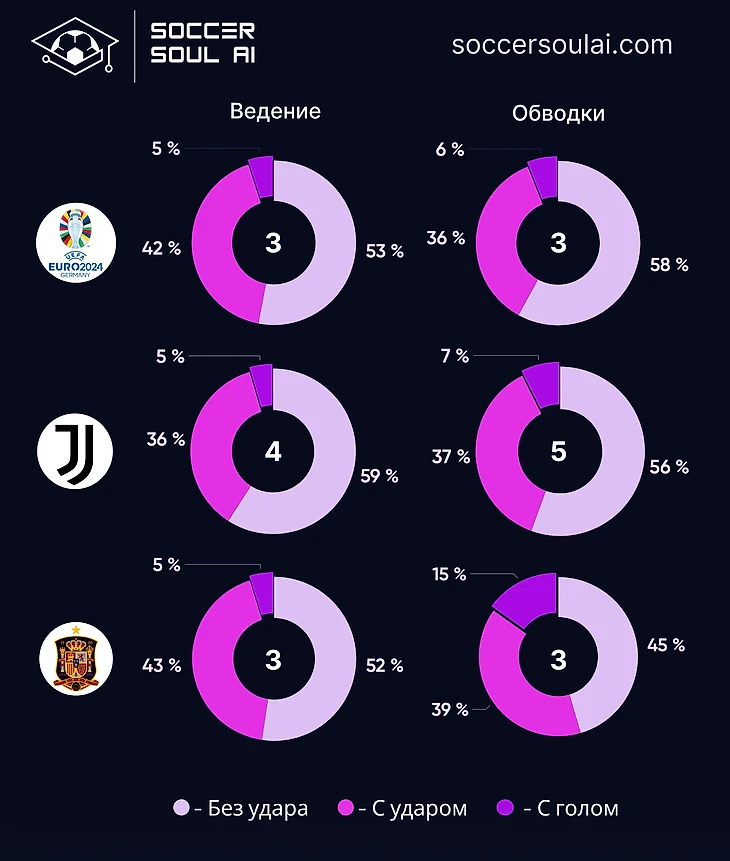 С точки зрения классификации игровых действий, Ювентус демонстрирует следующие соотношения долей: