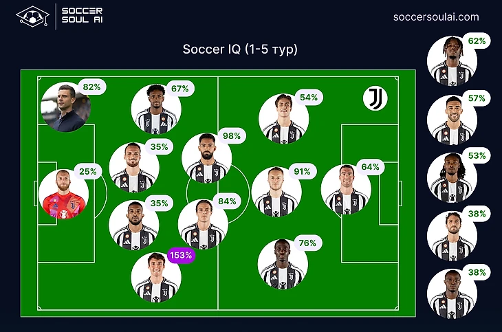 Ни по одной из них Юве пока в норму не вышел. Но, стоит отметить, что при собственном Soccer IQ 82%, соперников Мотта удерживает на Soccer IQ 47% и это вполне рабочая история – не давать сопернику демонстрировать качество игры выше, чем твоё собственное. Так тоже можно набирать очки. Другое дело, что вряд-ли от Мотты ожидают именно этого.