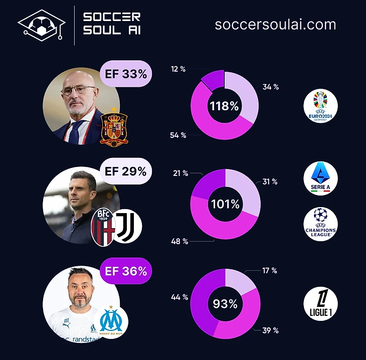 Сравнительный анализ проводится с показателями тренера, успешно решающего схожие игровые задачи, а также с коллективным аватаром соперника (на базе средних значений), позволяющим оценить качество своей обороны: Луис Де ла Фуэнте и его сборная Испании – общий эталон качества игры, со ставкой на активное АВП-движение в целом, при классическом показателе эффективности продвижения;
