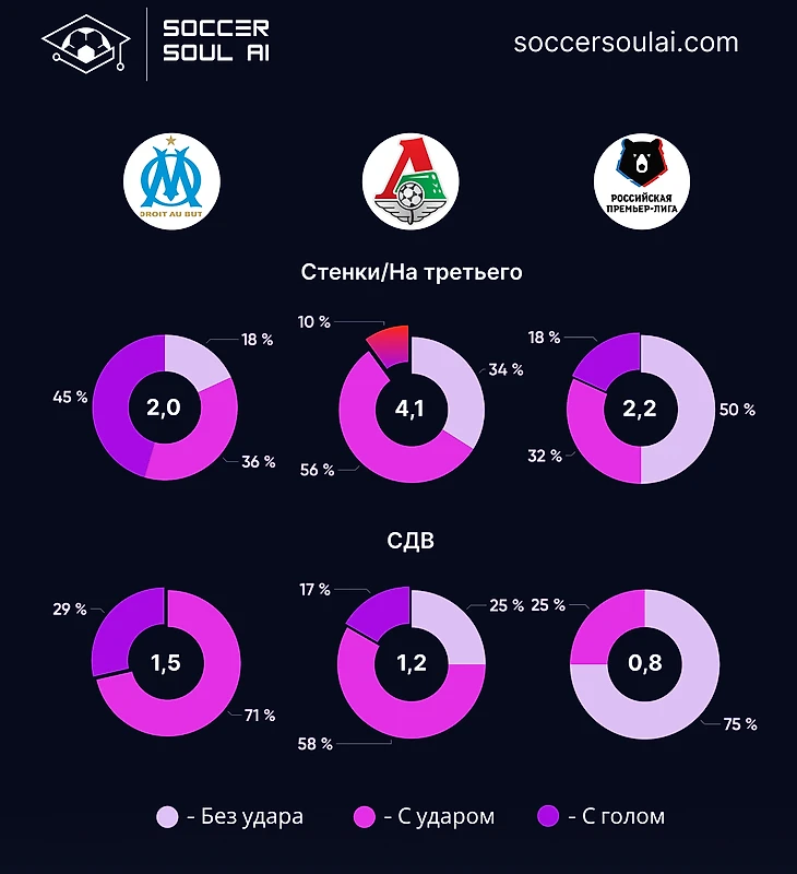 Марсель в этом контексте показывает зашкаливающую эффективность и результативность стенок (81% под удар или гол!). При этом СДВ (ситуации двойного выбор)– элементы технически более сложные, требующие более высокого уровня сыгранности футболистов, у Локомотива неплохо работают.