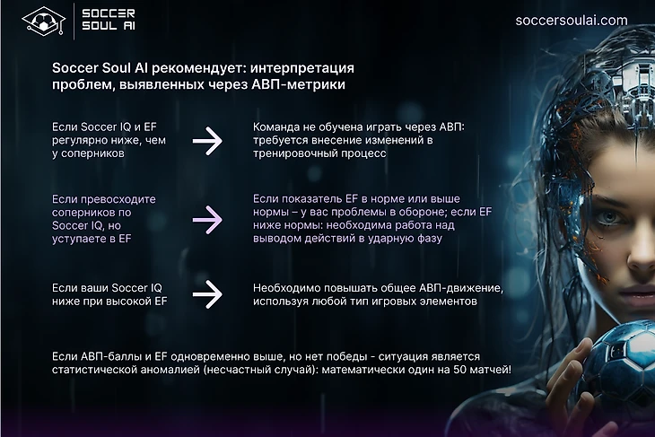 Таким образом выявляются три направления для решения проблемы эффективности: 1. Работать над увеличением собственного показателя EF(эффективности продвижения); 2. Работать над снижением показателя EF соперников; 3. Стремиться к уровню Soccer IQ - 118% за матч на регулярной основе.
