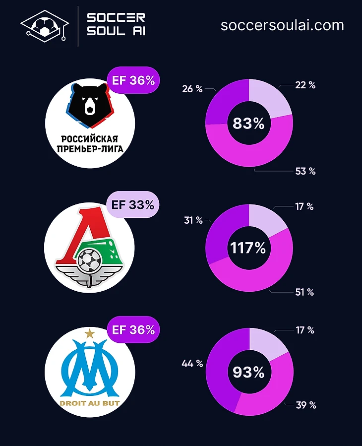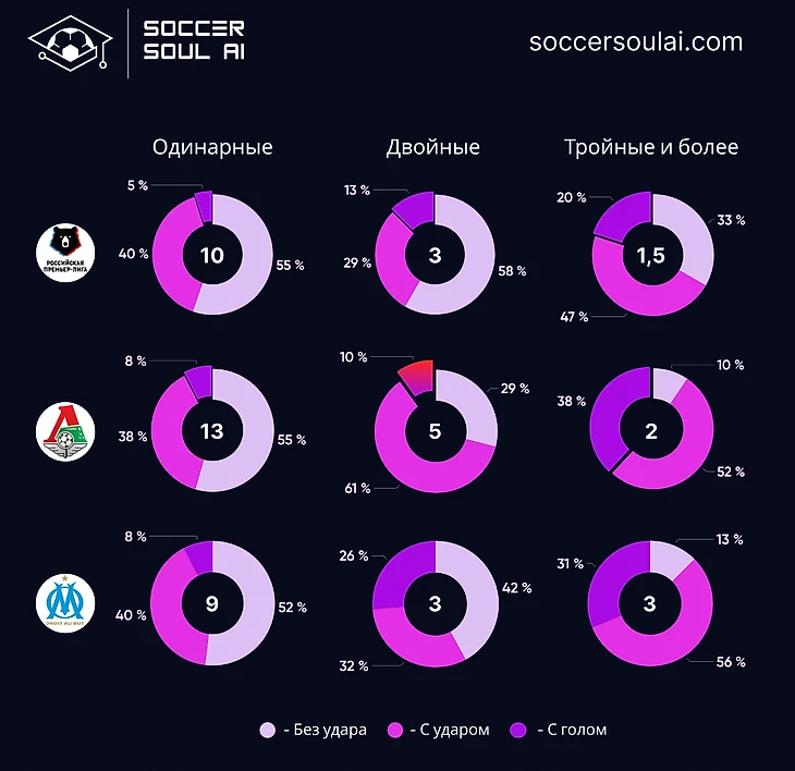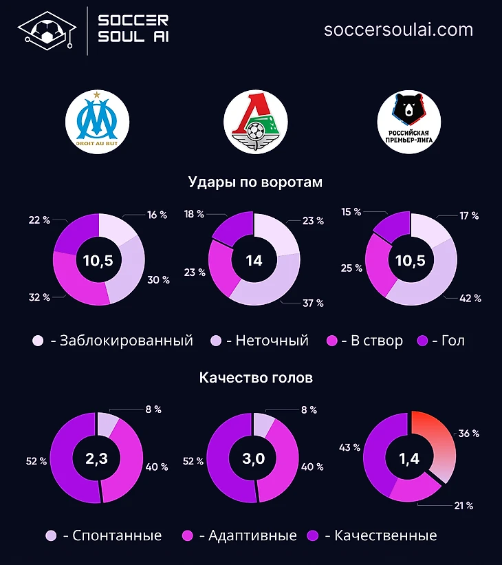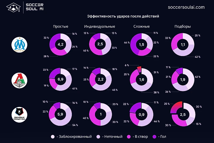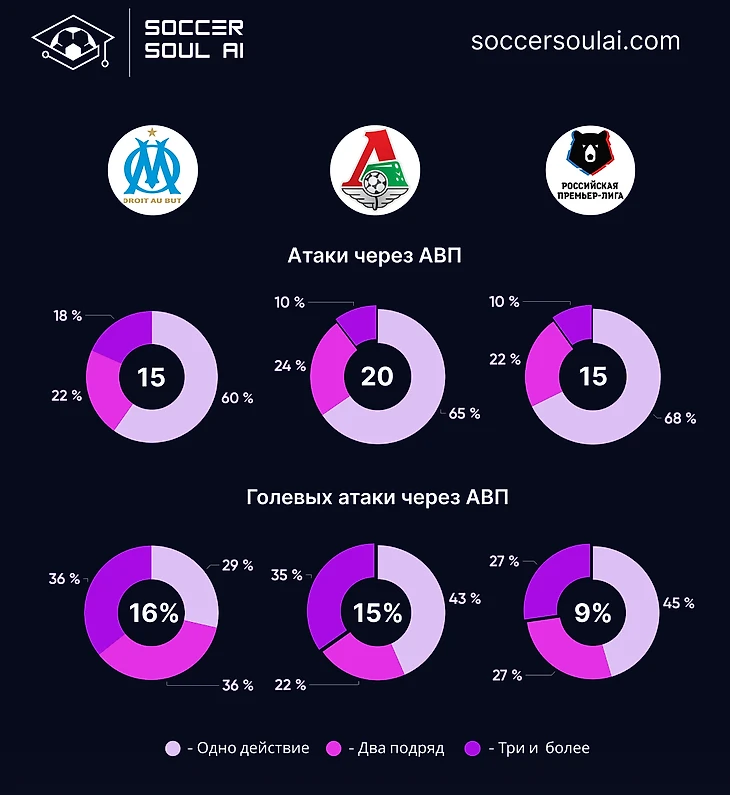 Количество атак через АВП Локомотива больше, чем у соперников и команды Де Дзерби. Процент голевых атак сопоставим с показателями французской команды и заметно выше, чем у коллег по РПЛ. Локомотив уступает Марселю только по доле атак с тремя и более подряд АВП-действиями.