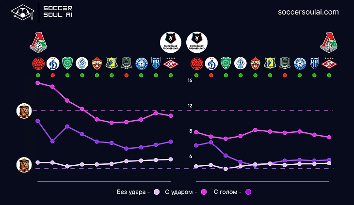 При этом, если Soccer IQ команды в ударных атаках балансирует в районе эталонных испанских, то баллы в голевых атаках их заметно превосходят. При сравнении с аналогичными показателями соперников, заметен нисходящий тренд ударной кривой и невысокий уровень голевого графика оппонентов Локомотива, демонстрирующий очевидное преимущество команды в АВП-движении и его результативности.