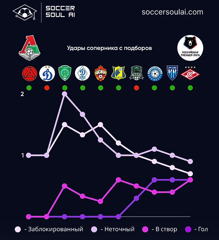 Локомотив бьёт по воротам часто. Точность его ударов (41%) и реализация (18%) выше среднего. Но, вместе с тем соперникам в фазе завершения он позволяет демонстрировать не менее впечатляющие цифры: 40% - точность, 15% - реализация. Рассматривая качество голов, мы находим еще один выделяющийся фактор – 36% мячей, пропускаемых Локомотивом – спонтанные. Это голы после отскоков, подборов, рикошетов и т.п. говорящие об определенной потере концентрации или запоздалой реакции обороны на случайное развитие событий.