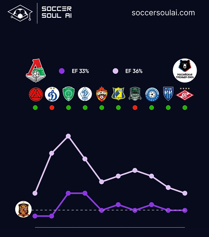 На дистанции десяти туров Локомотив превосходит соперников по показателю SoccerIQ. Более того, среднее значение метрики сейчас находится на уровне эталонной сборной Испании, а с начала сезона ни разу не опускалось ниже среднего Soccer IQ Евро-24, принимаемого за 100%. Вместе с тем, команде удаётся на дистанции удерживать показатели соперников ниже линии среднего значения, подтверждая общую положительную картину с общим качеством игры Локомотива.